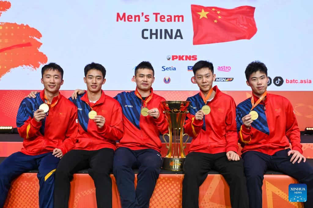 Members of team China pose for photos during the awarding ceremony after the men's team final between China and Malaysia at the Badminton Asia Team Championships 2024 in Shah Alam, Selangor, Malaysia, Feb. 18, 2024. (Photo by Chong Voon Chung/Xinhua)