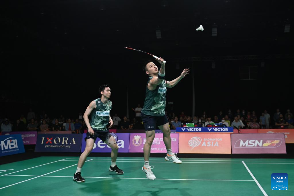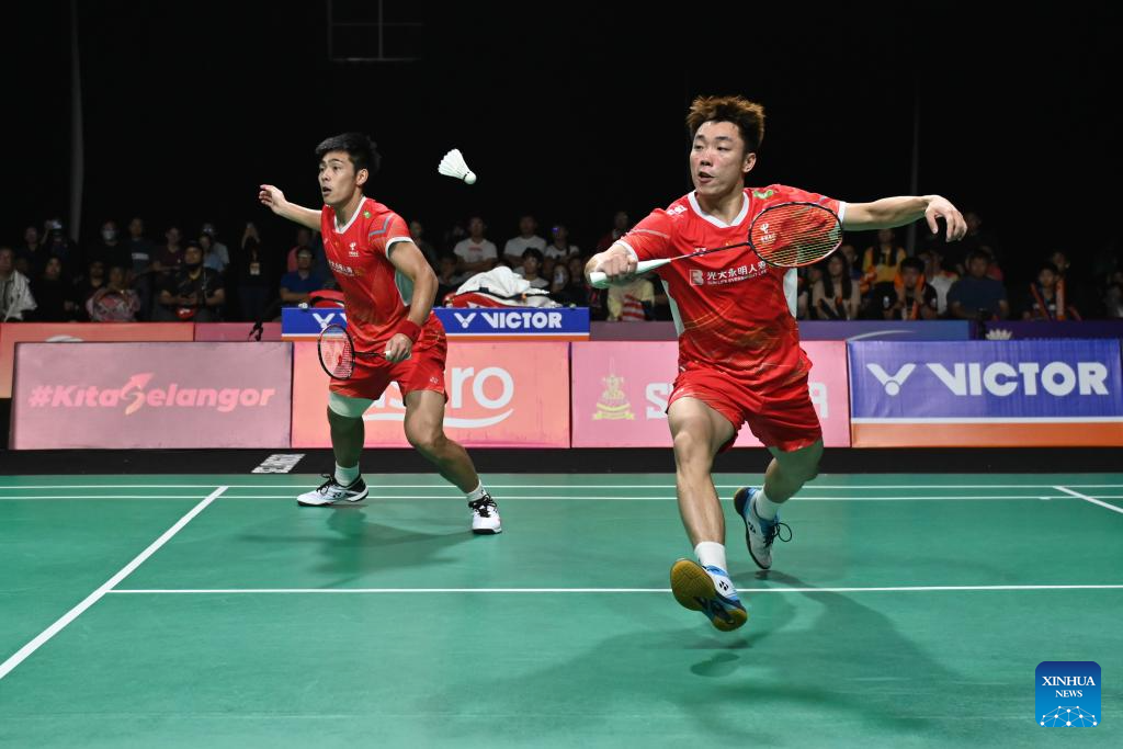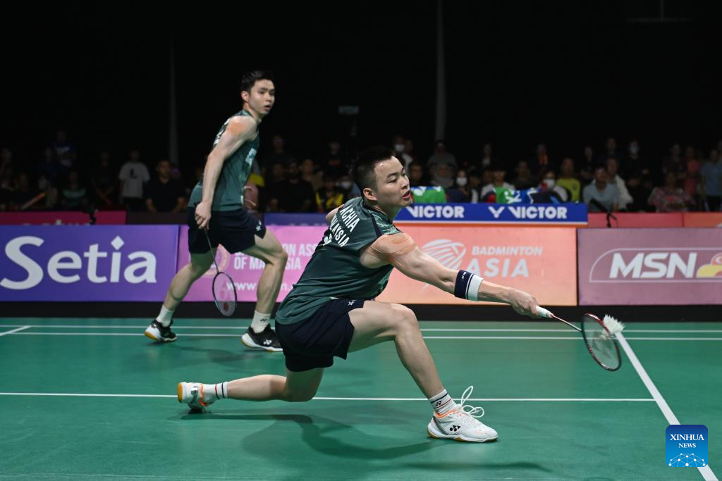 Xie Haonan(R)/Zeng Weihan of China compete against Aaron Chia Teng Fong/Soh Wooi Yik of Malaysia during the men's team final between China and Malaysia at the Badminton Asia Team Championships 2024 in Shah Alam, Selangor, Malaysia, Feb. 18, 2024. (Photo by Chong Voon Chung/Xinhua)