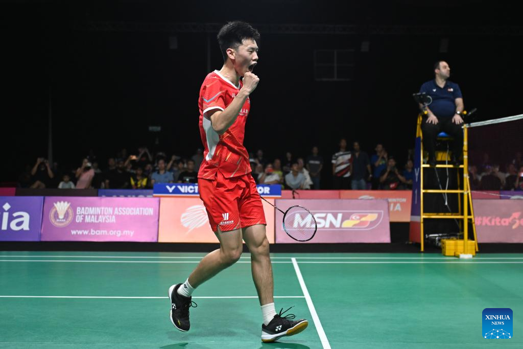 Lei Lanxi of China celebrates after winning Eogene Ewe of Malaysia during the men's team final between China and Malaysia at the Badminton Asia Team Championships 2024 in Shah Alam, Selangor, Malaysia, Feb. 18, 2024. (Photo by Chong Voon Chung/Xinhua)