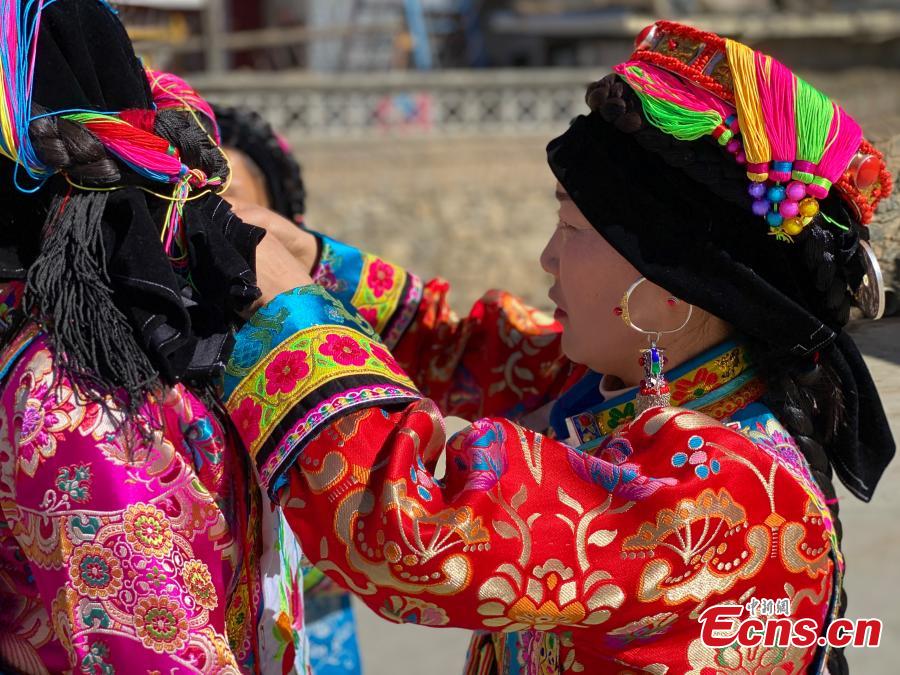 Women dressed in traditional costumes perform Guozhuang dance to celebrate the Tibetan New Year in Gannan Tibetan Autonomous Prefecture, northwest China's Gansu Province. (Photo/China News Service)
