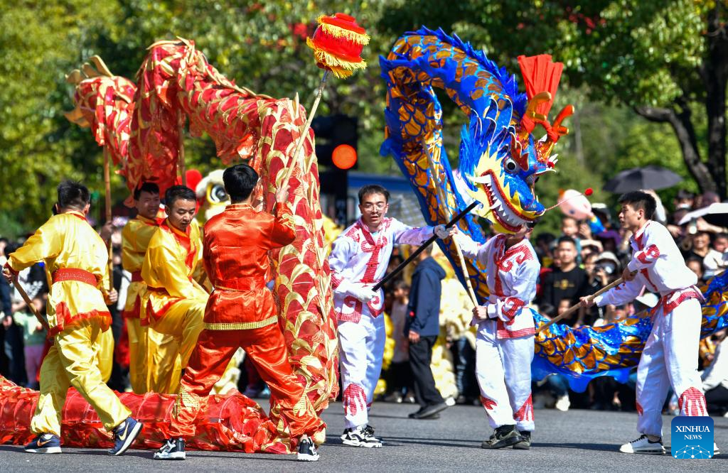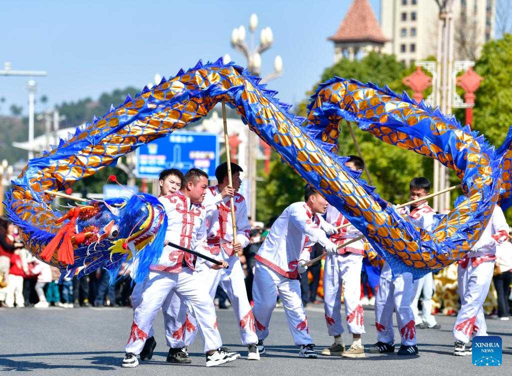People perform dragon dance during a Chinese Lunar New Year celebration event in Longli County, southwest China's Guizhou Province, Feb. 18, 2024. (Xinhua/Yang Wenbin)