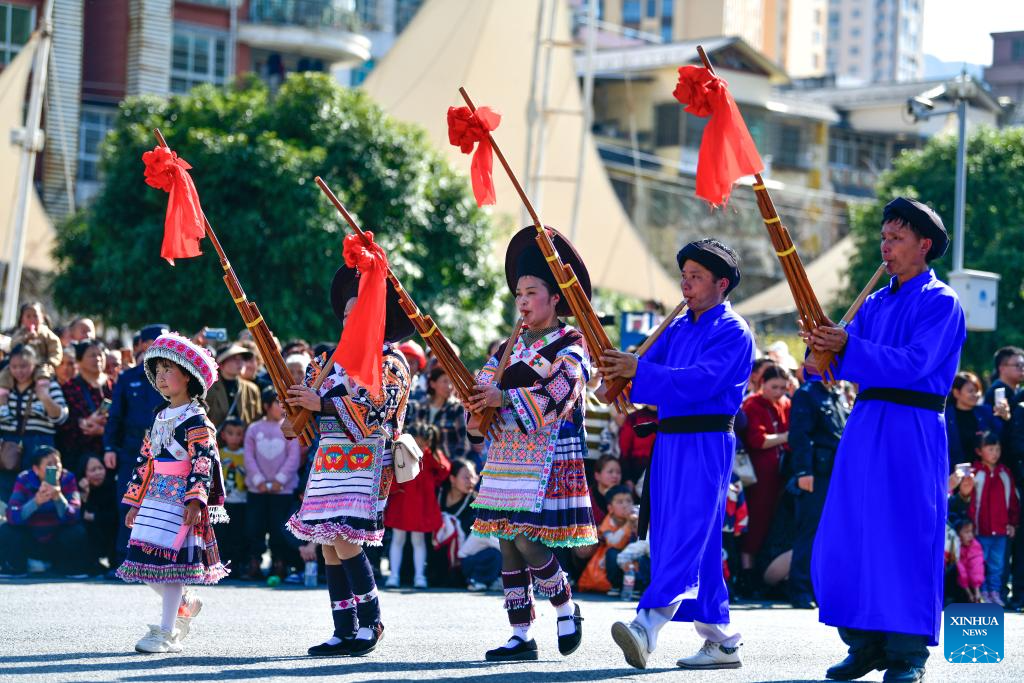 People dance while playing Lusheng, a reed-pipe wind instrument, during a Chinese Lunar New Year celebration event in Longli County, southwest China's Guizhou Province, Feb. 18, 2024. (Xinhua/Yang Wenbin)