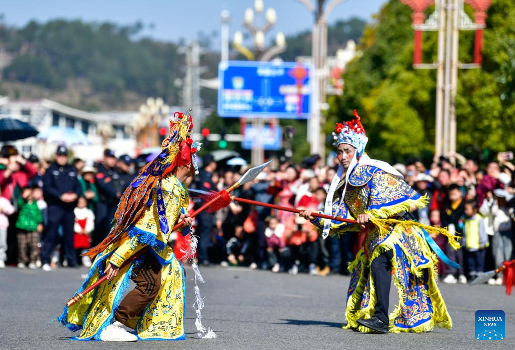 People perform local opera during a Chinese Lunar New Year celebration event in Longli County, southwest China's Guizhou Province, Feb. 18, 2024. (Xinhua/Yang Wenbin)