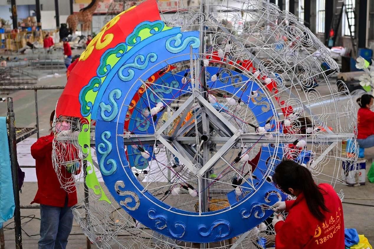 In a workshop of Zigong Longteng Culture and Art Co., Ltd. based in Zigong, southwest China's Sichuan province, the skeleton of a loong-shaped lantern was completed amid flying sparks from welding.