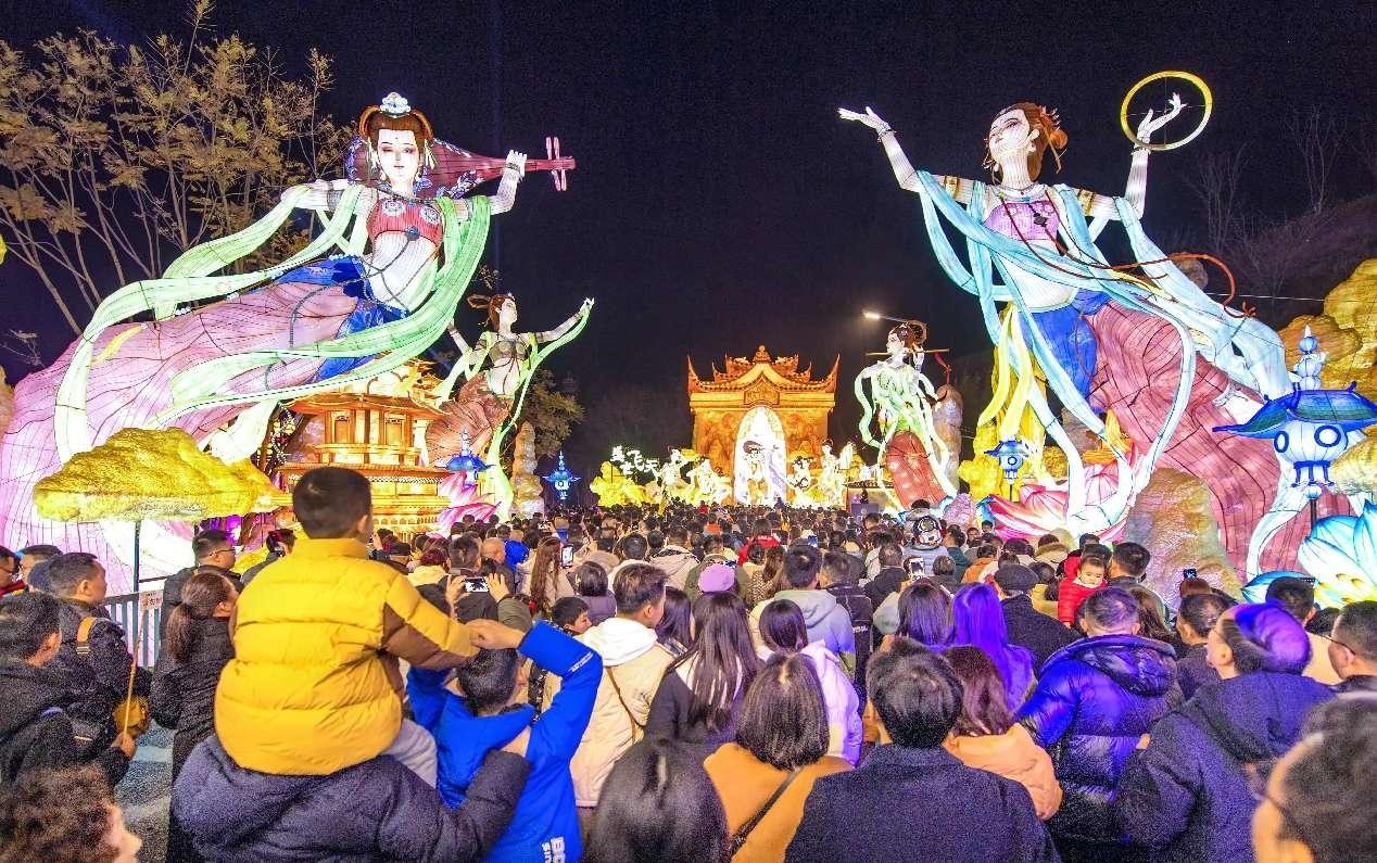 People visit the 30th Zigong International Dinosaur Lantern Festival in Zigong, southwest China's Sichuan province, Feb. 10, 2024. (People's Daily Online/Xue Jun)