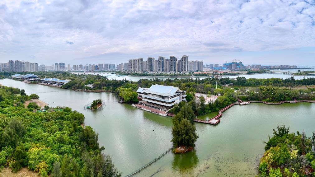 An aerial panoramic drone photo taken on Jan. 23, 2024 shows the Wuyuan Bay wetland park and its surroundings in Xiamen, southeast China's Fujian Province.(Xinhua/Jiang Kehong)