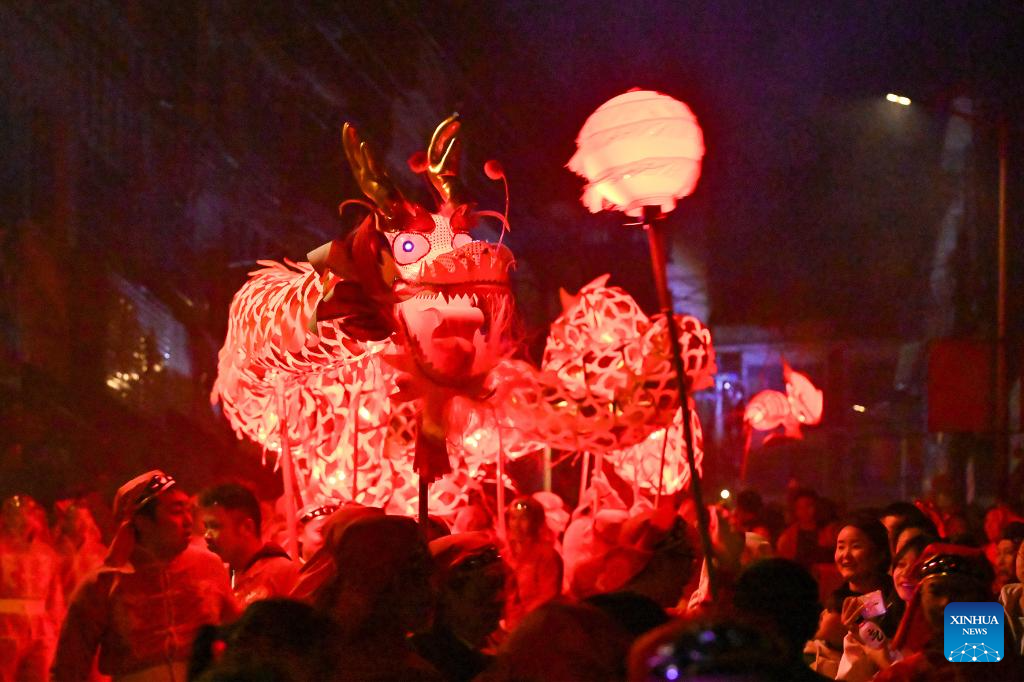 Villagers holding benches perform lantern dragon dance in Lixin Village of Jinhua City, east China's Zhejiang Province, Feb. 19, 2024. As the Lantern Festival approaches, villagers perform lantern dragon dance for good fortune and happiness. (Xinhua/Xu Yu)