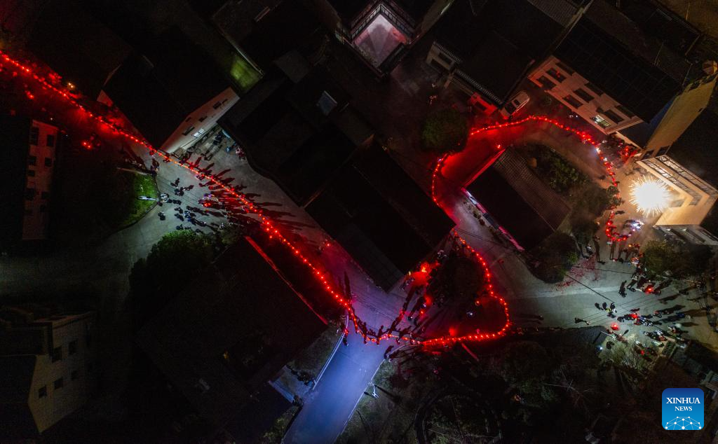 An aerial drone photo taken on Feb. 19, 2024 shows villagers performing lantern dragon dance in Xiazhai Village of Jinhua City, east China's Zhejiang Province. As the Lantern Festival approaches, villagers perform lantern dragon dance for good fortune and happiness. (Xinhua/Xu Yu)