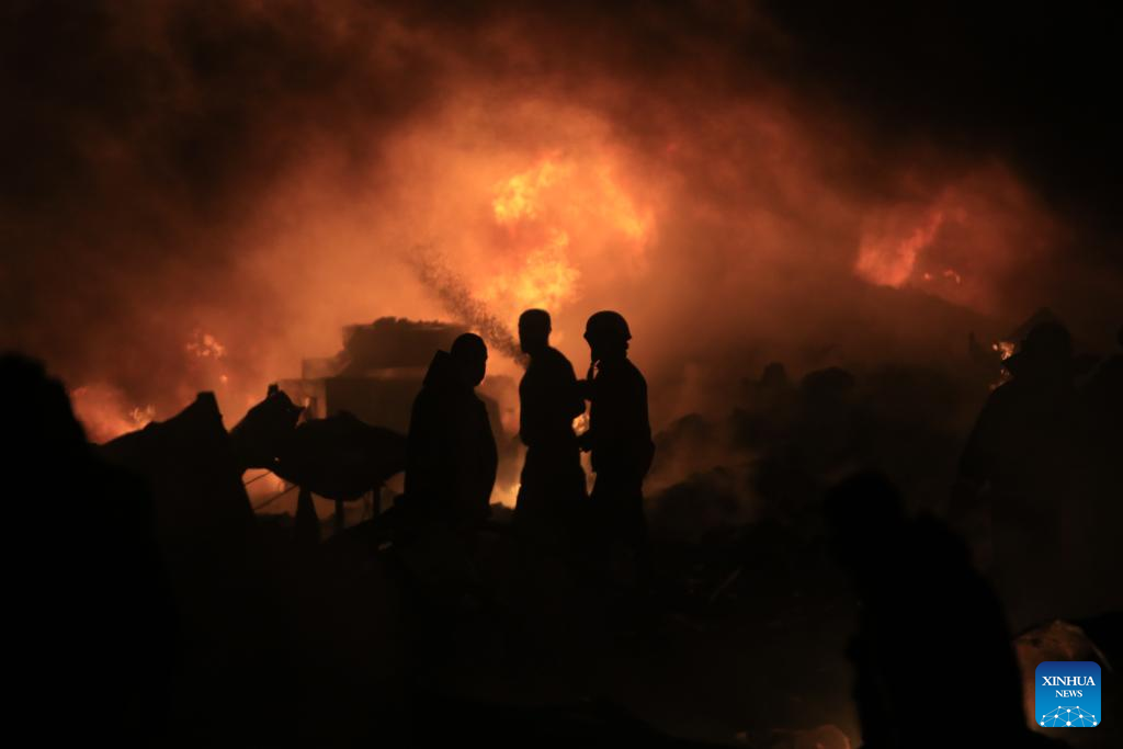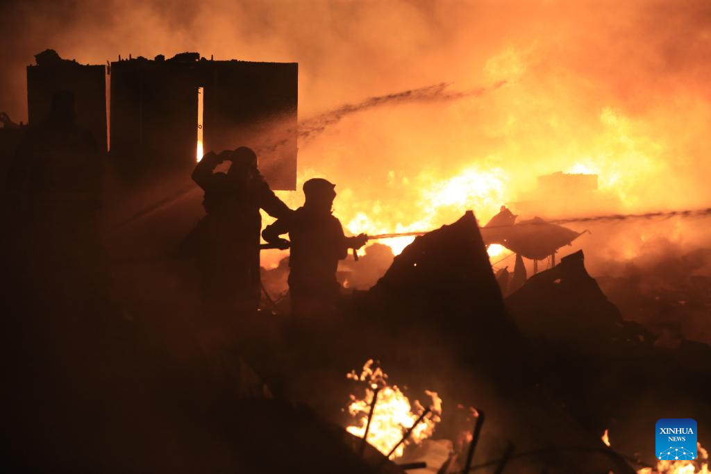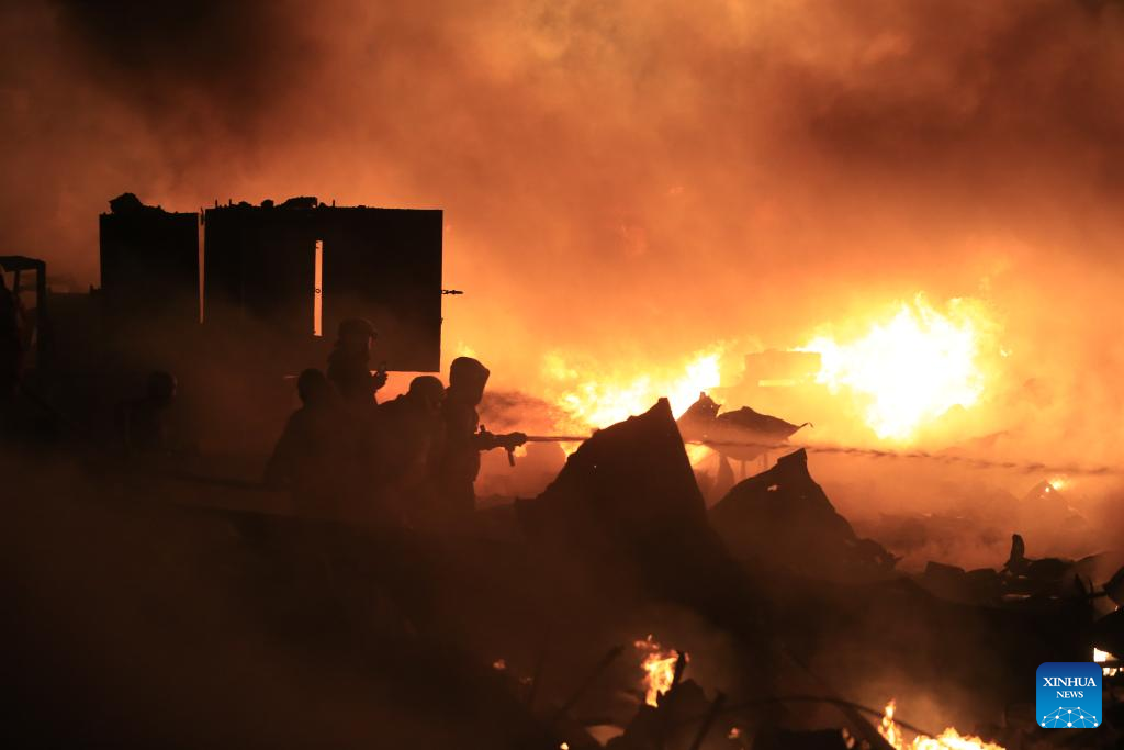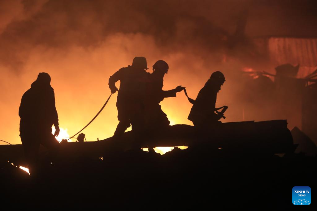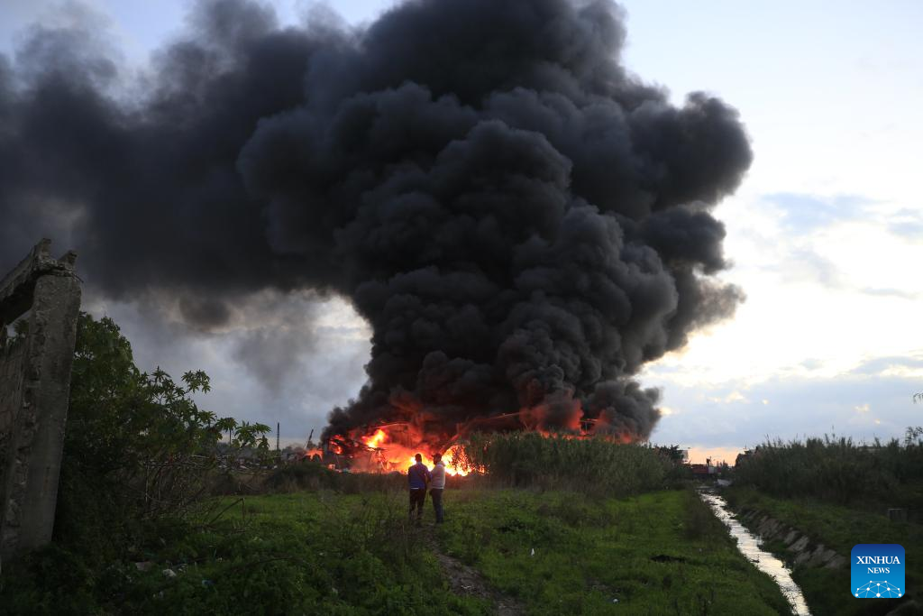 Firefighters extinguish fire caused by Israeli airstrike in Ghazieh, Lebanon, on Feb. 19, 2024. Israeli warplanes on Monday afternoon hit multiple targets in the southern town of Ghazieh with air-to-surface missiles, injuring 14 people, Lebanese military sources told Xinhua. (Photo by Ali Hashisho/Xinhua)