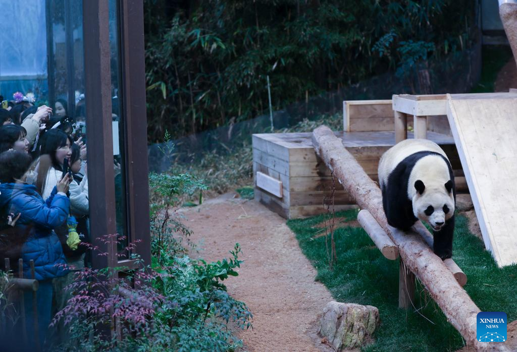 People watch giant panda Fu Bao at Everland theme park in Yongin, South Korea, Feb. 20, 2024. Giant panda Fu Bao is scheduled to return to China in April. (Xinhua/Yao Qilin)