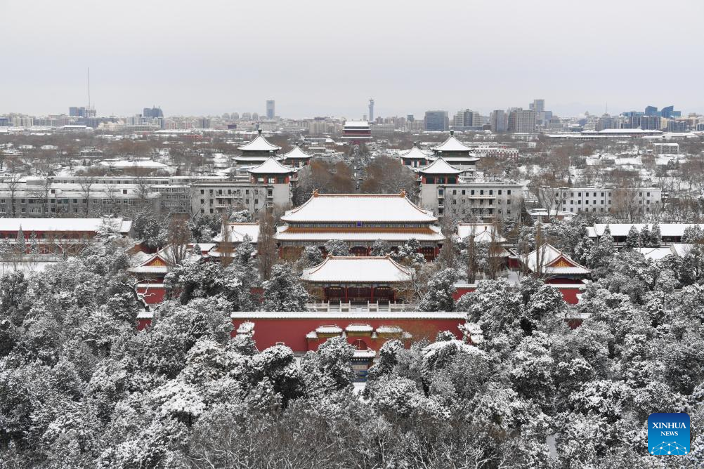 This photo taken on Feb. 21, 2024 shows the snow scenery at Jingshan Park in Beijing, capital of China. Beijing saw a snowfall on Tuesday. (Xinhua/Ju Huanzong)
