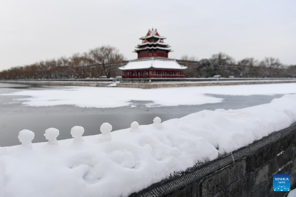 People walk near a turret of the Palace Museum in Beijing, capital of China, Feb. 21, 2024. Beijing saw a snowfall on Tuesday. (Xinhua/Ju Huanzong)