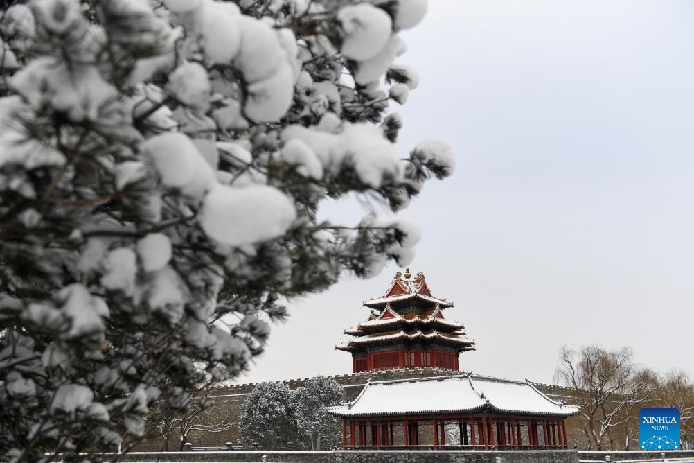 This photo taken from Jingshan Park on Feb. 21, 2024 shows the Palace Museum in Beijing, capital of China. Beijing saw a snowfall on Tuesday. (Xinhua/Ju Huanzong)