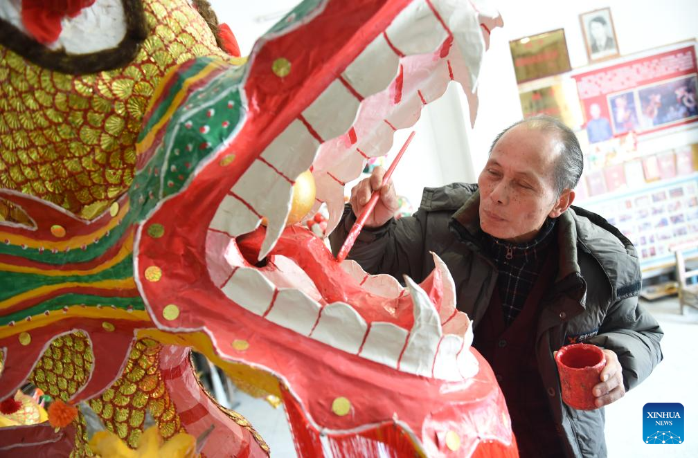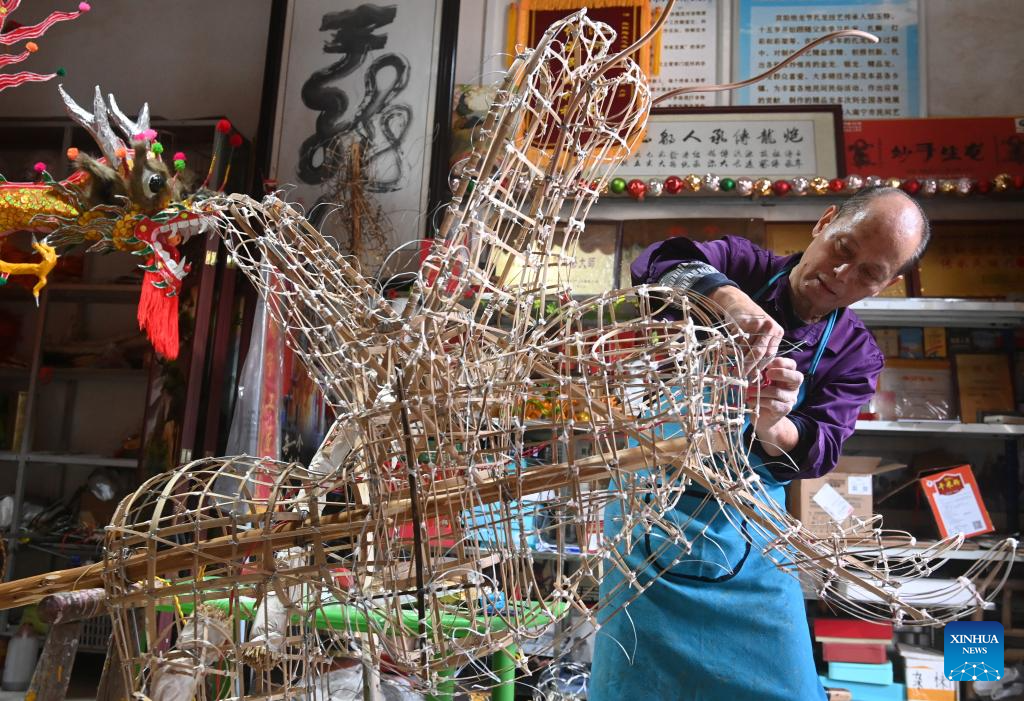 Craftsman Zou Yute makes a bamboo dragon for Firecracker Dragon Festival in Binyang County in south China's Guangxi Zhuang Autonomous Region, Jan. 16, 2024. (Xinhua/Lu Boan)
