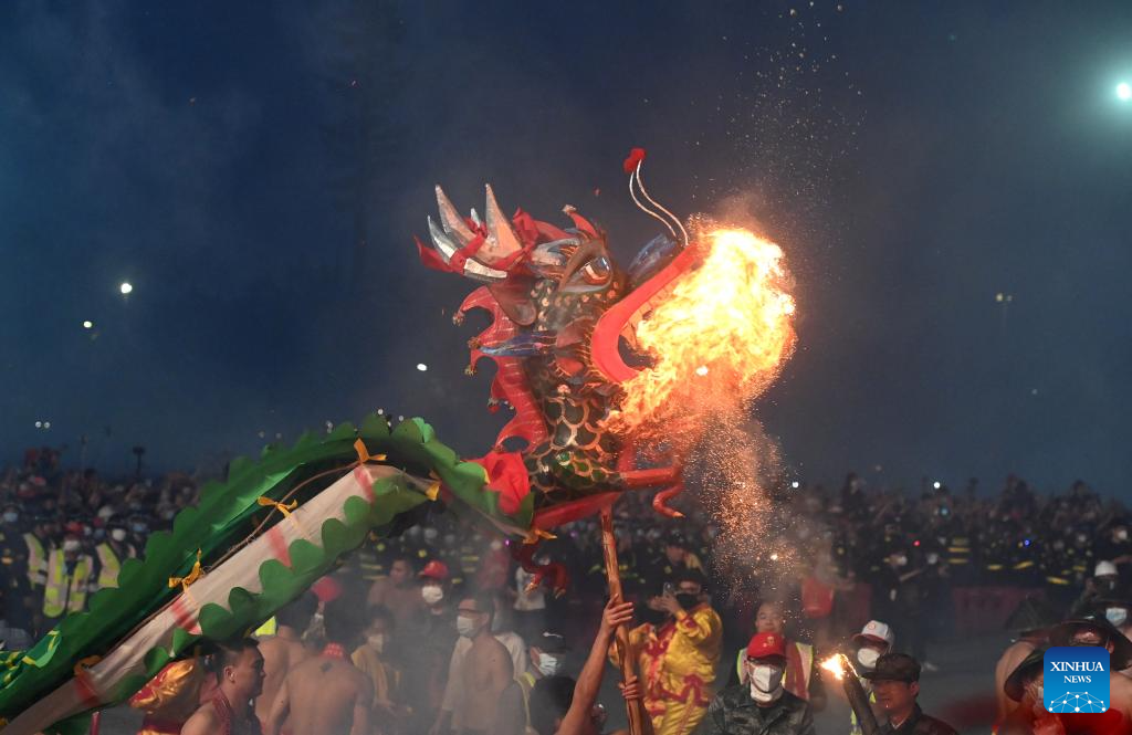 People perform firecracker dragon dance during Firecracker Dragon Festival in Binyang County, south China's Guangxi Zhuang Autonomous Region, Feb. 20, 2024. (Xinhua/Lu Boan)