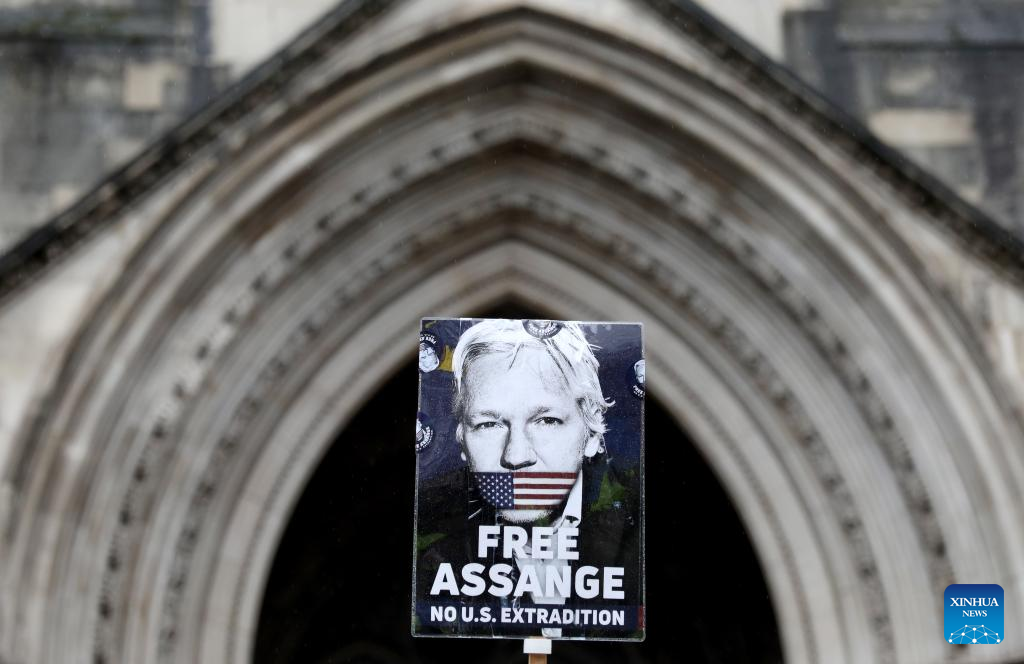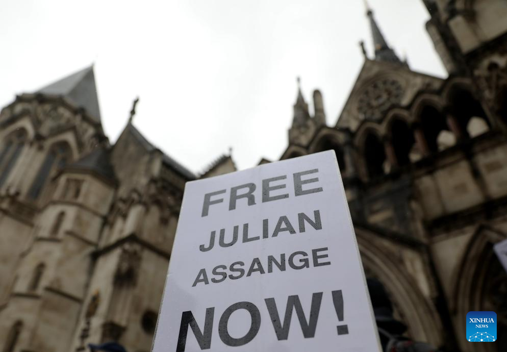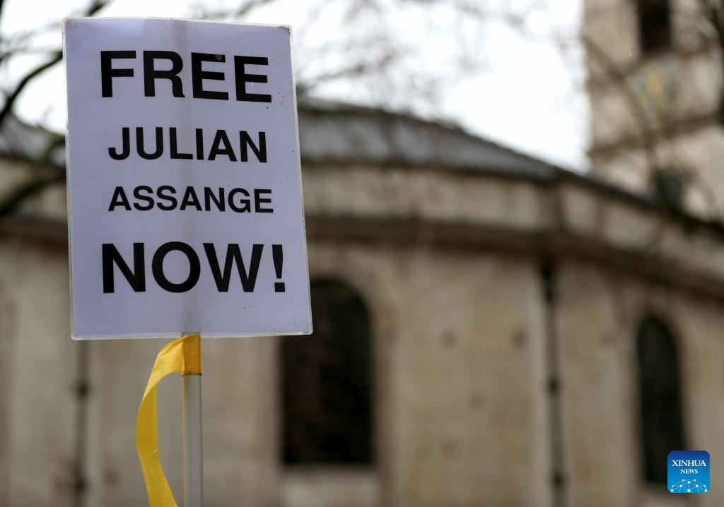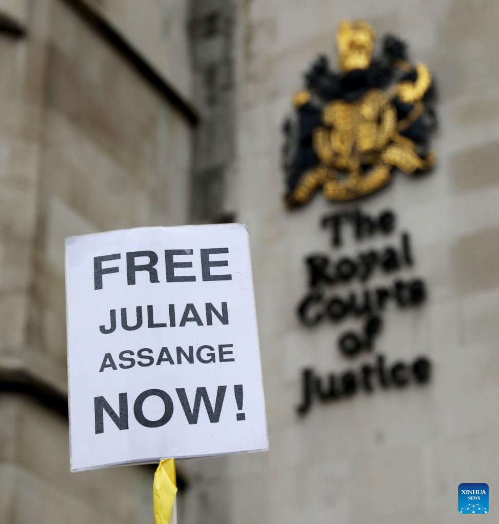 A sign showing support for WikiLeaks founder Julian Assange is seen in a protest outside the United Kingdom (UK) High Court in London, Britain, on Feb. 21, 2024. (Xinhua/Li Ying)