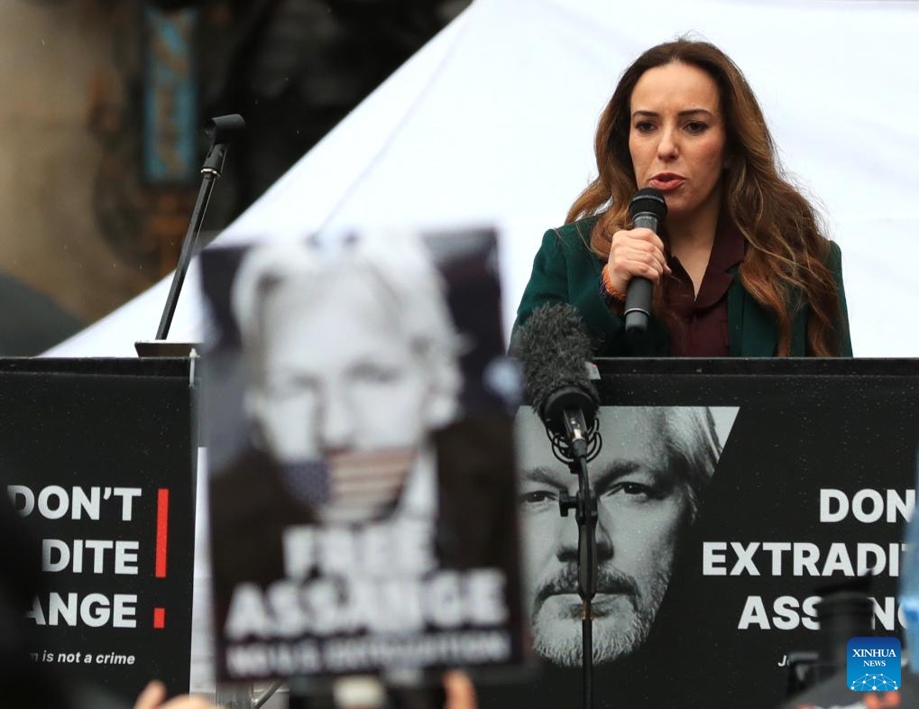 WikiLeaks founder Julian Assange's wife Stella Assange speaks outside the United Kingdom (UK) High Court in London, Britain, on Feb. 21, 2024. (Xinhua/Li Ying)