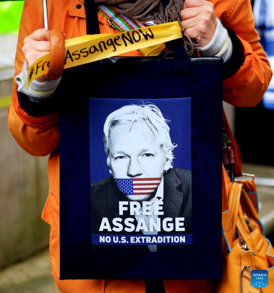 A banner showing support for WikiLeaks founder Julian Assange is seen in a protest outside the United Kingdom (UK) High Court in London, Britain, on Feb. 21, 2024. (Xinhua/Li Ying)