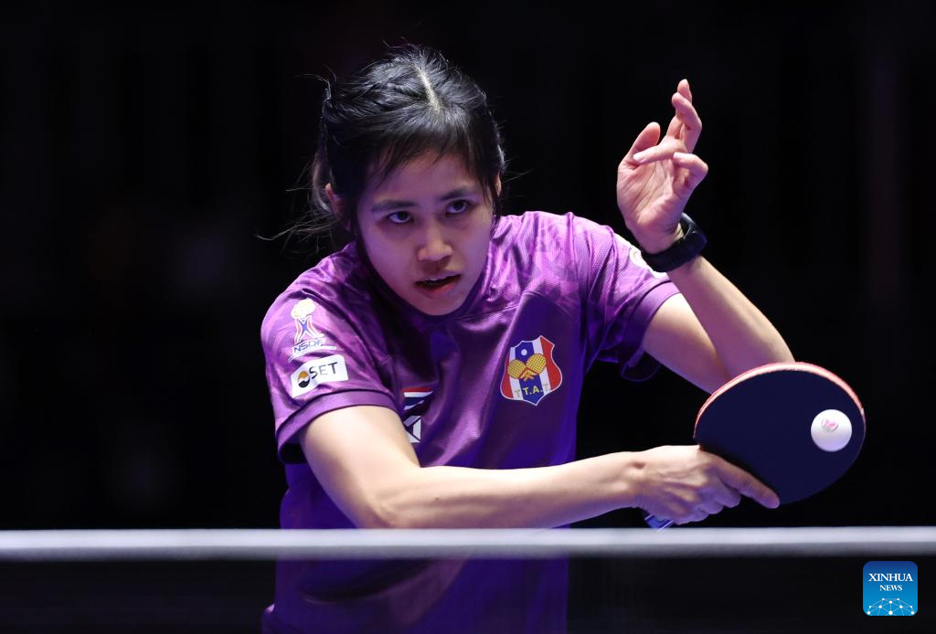 Jinnipa Sawettabut of Thailand competes against Sun Yingsha of China during the women's team round of 16 match between China and Thailand at the ITTF World Team Table Tennis Championships Finals Busan 2024 in Busan, South Korea, Feb. 21, 2024. (Xinhua/Yang Shiyao)