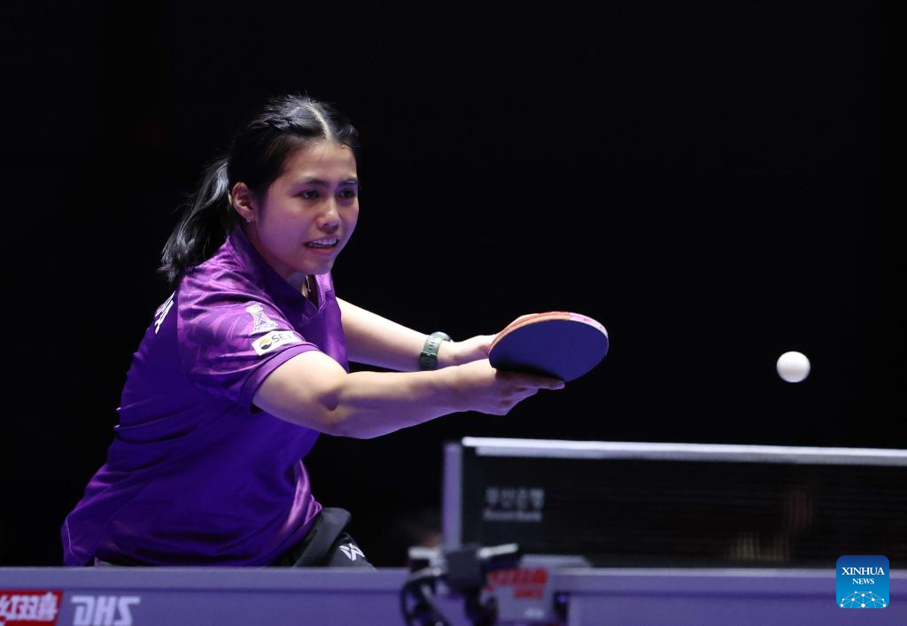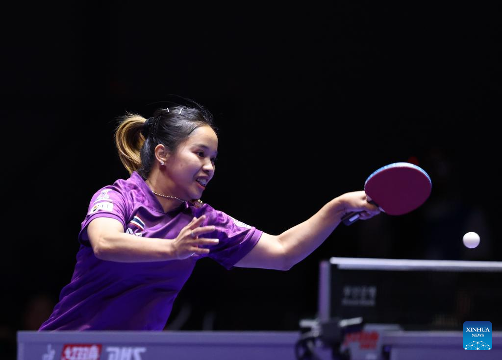 Orawan Paranang of Thailand competes against Wang Yidi of China during the women's team round of 16 match between China and Thailand at the ITTF World Team Table Tennis Championships Finals Busan 2024 in Busan, South Korea, Feb. 21, 2024. (Xinhua/Yang Shiyao)