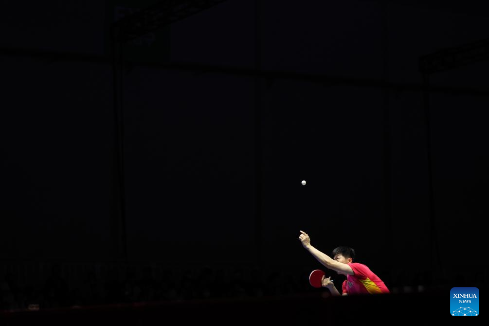 Fan Zhendong of China competes against Eduard Ionescu of Romania during the men's team round of 16 match at the ITTF World Team Table Tennis Championships Finals Busan 2024 in Busan, South Korea, Feb. 21, 2024. (Xinhua/Zhang Tao)