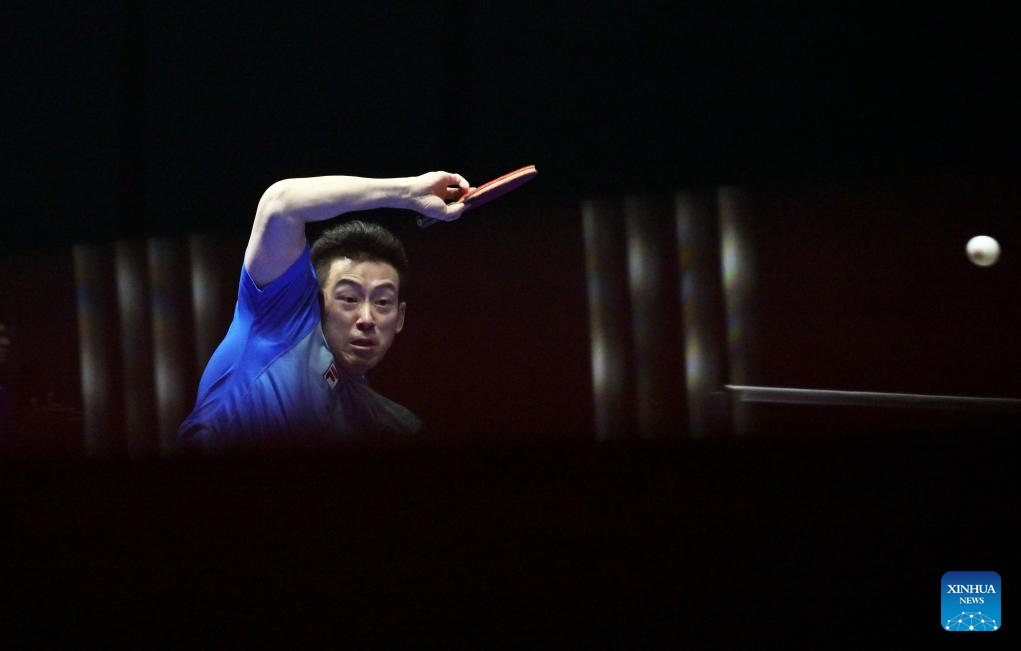 Kao Cheng-Jui of Chinese Taipei competes against Marko Jevtovic of Serbia during the men's team round of 32 match between Chinese Taipei and Serbia at the ITTF World Team Table Tennis Championships Finals Busan 2024 in Busan, South Korea, Feb. 21, 2024. (Xinhua/Yang Shiyao)