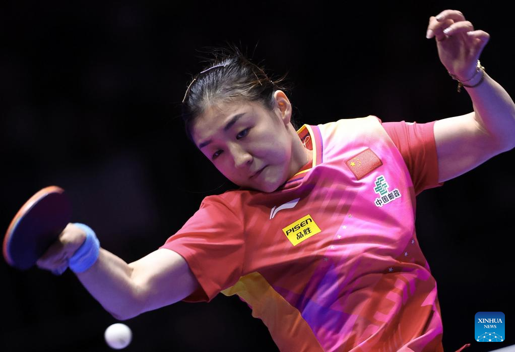 Chen Meng of China competes against Suthasini Sawettabut of Thailand during the women's team round of 16 match between China and Thailand at the ITTF World Team Table Tennis Championships Finals Busan 2024 in Busan, South Korea, Feb. 21, 2024. (Xinhua/Yang Shiyao)
