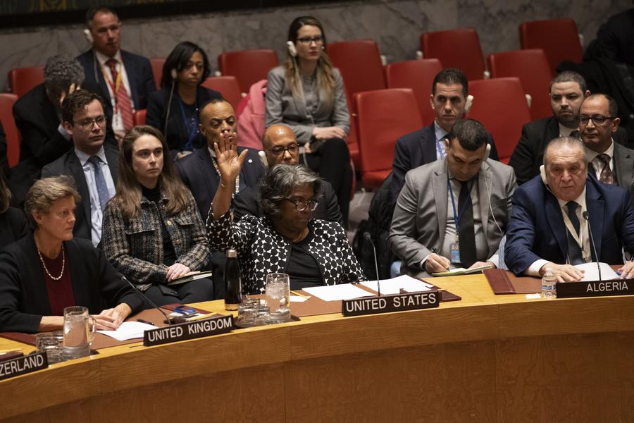U.S. ambassador to the United Nations Linda Thomas-Greenfield (C, front) votes against a Gaza-related Security Council draft resolution at the UN headquarters in New York, on Feb. 20, 2024. (Xinhua/Xie E)