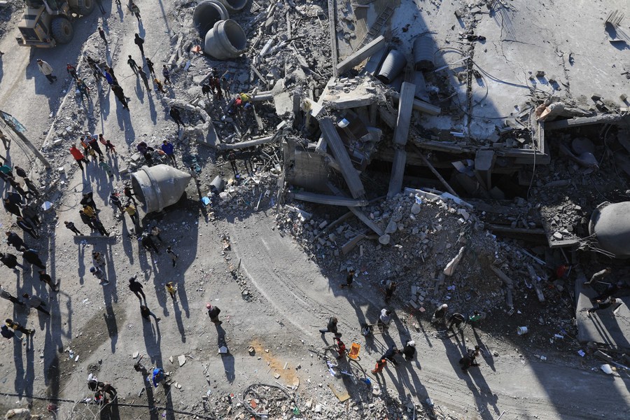 People are seen in a destroyed building after an Israeli airstrike in the southern Gaza Strip city of Rafah, on Feb. 22, 2024. (Photo by Yasser Qudih/Xinhua)