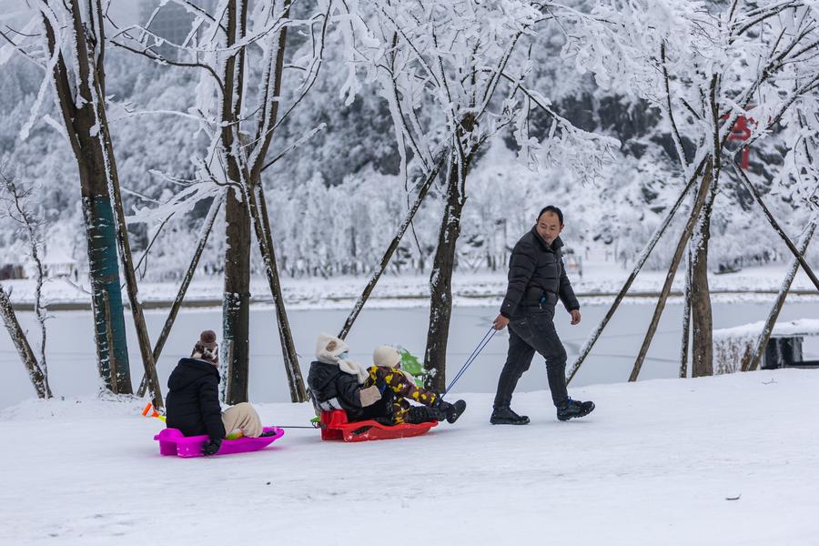 Tourists have fun at Nantian Lake scenic area in Fengdu County, southwest China's Chongqing Municipality, Jan. 25, 2024. (Xinhua/Chu Jiayin)