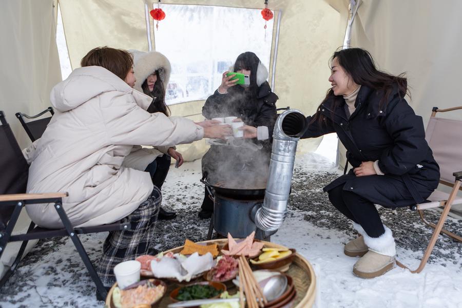 Tourists enjoy snowfield hotpot at Nantian Lake scenic area in Fengdu County, southwest China's Chongqing Municipality, Jan. 25, 2024. (Xinhua/Chu Jiayin)