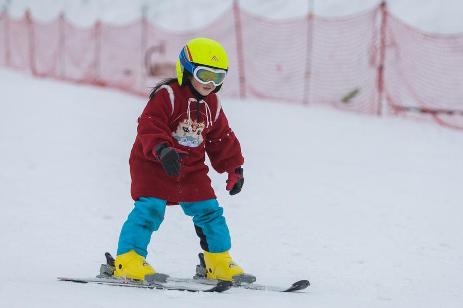 A child skis at Lengshui international ski resort in Shizhu Tujia Autonomous County, southwest China's Chongqing Municipality, Jan. 26, 2024. (Xinhua/Chu Jiayin)
