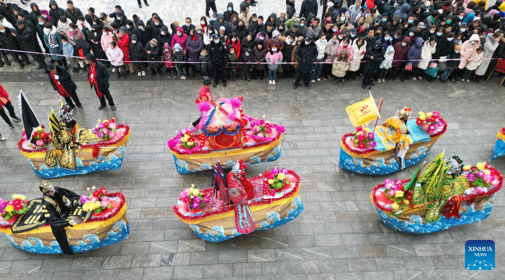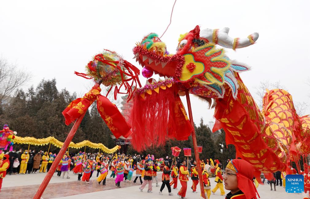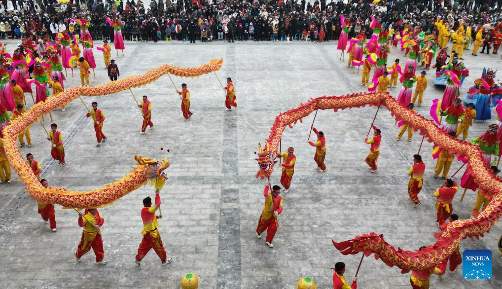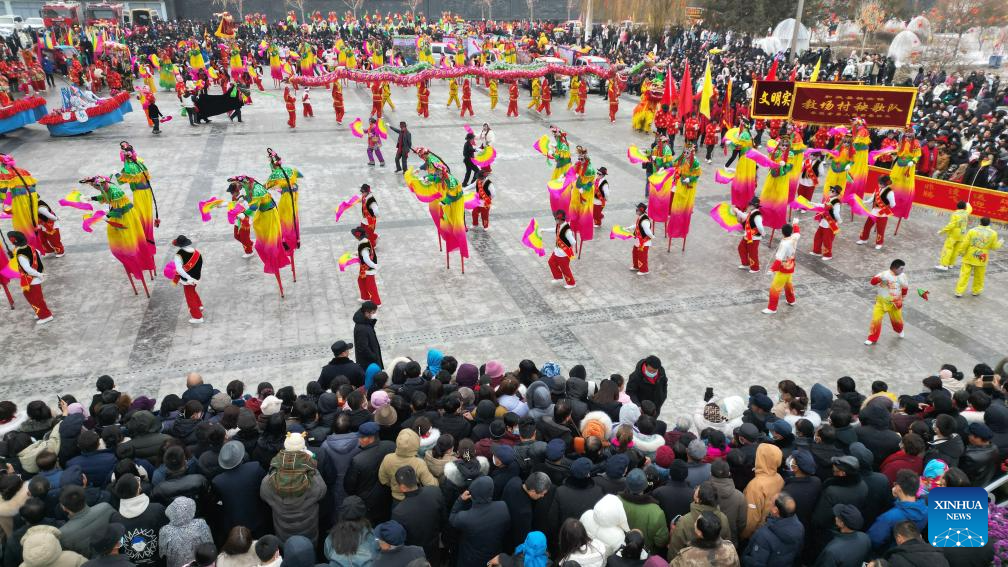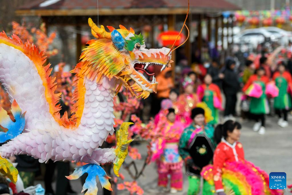 People perform in celebration of the upcoming Lantern Festival in Shiqiaotou Village of Zunhua City, north China's Hebei Province, Feb. 22, 2024. The Lantern Festival falls on Feb. 24 this year. (Photo by Liu Mancang/Xinhua)