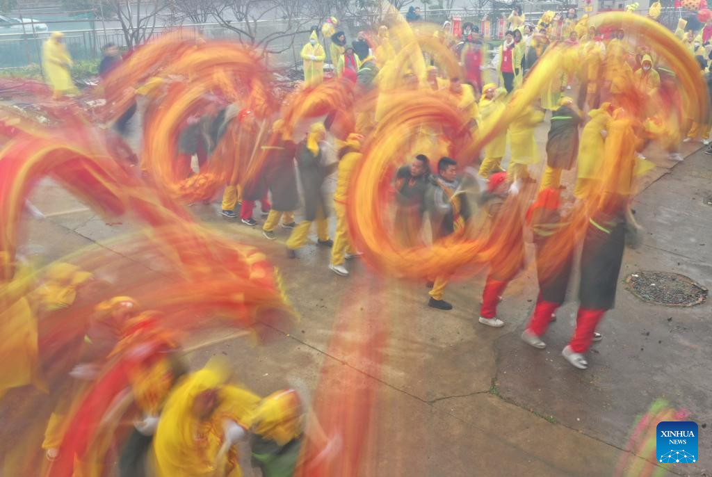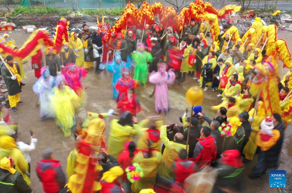 People perform dragon dance in celebration of the upcoming Lantern Festival in Daiyingling Town of Hengyang City, central China's Hunan Province, Feb. 22, 2024. The Lantern Festival falls on Feb. 24 this year. (Photo by Cao Zhengping/Xinhua)
