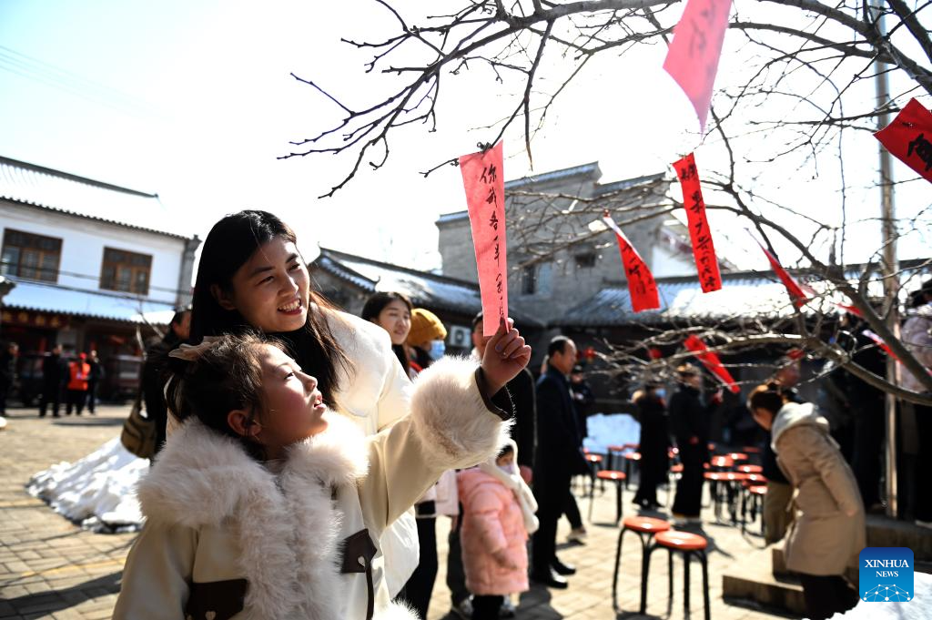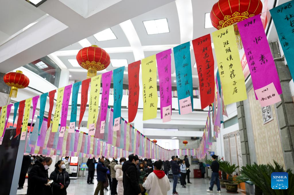 People take part in a riddle game in celebration of the upcoming Lantern Festival in Hanshan District of Handan City, north China's Hebei Province, Feb. 22, 2024. The Lantern Festival falls on Feb. 24 this year. (Photo by Hu Qinghua/Xinhua)