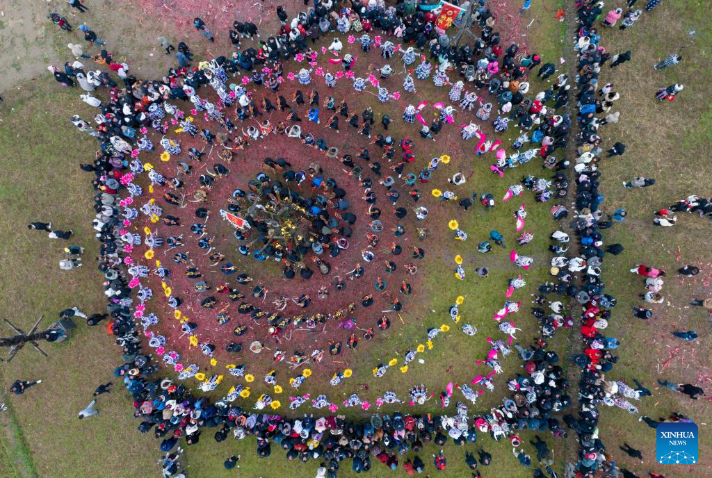 An aerial photo taken on Feb. 22, 2024 shows people watching a performance in celebration of the upcoming Lantern Festival in Rongshui Miao Autonomous County, south China's Guangxi Zhuang Autonomous Region. The Lantern Festival falls on Feb. 24 this year. (Photo by Long Tao/Xinhua)