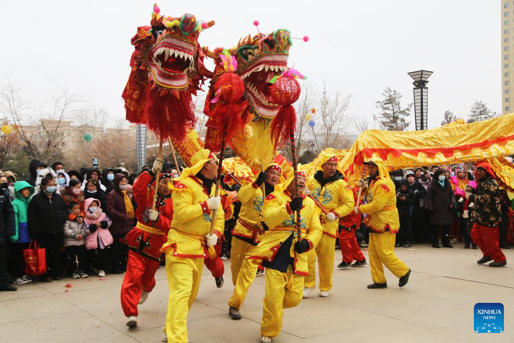 People perform dragon dance in celebration of the upcoming Lantern Festival in Anding District of Dingxi City, northwest China's Gansu Province, Feb. 22, 2024. The Lantern Festival falls on Feb. 24 this year. (Photo by Wang Kexian/Xinhua)