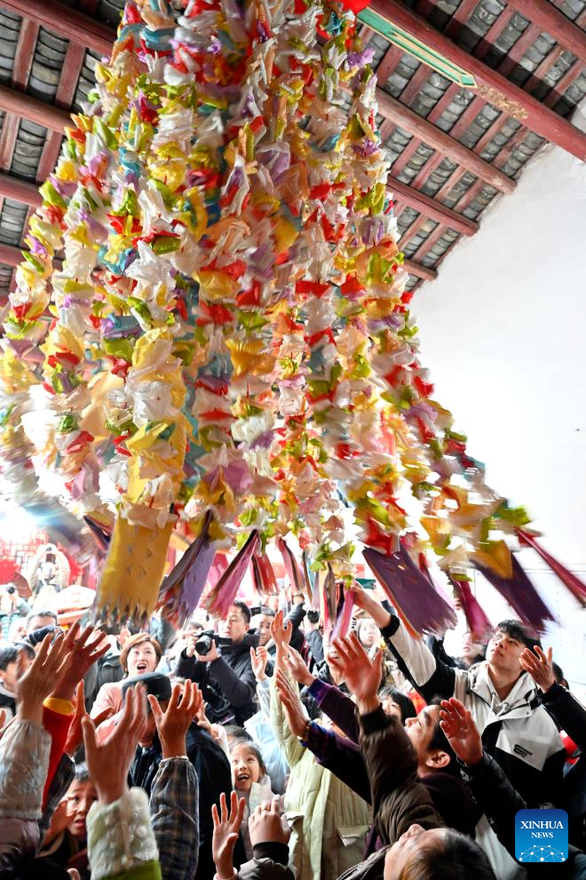 People take part in an event celebrating the upcoming Lantern Festival in Jinde Town of Liuzhou City, south China's Guangxi Zhuang Autonomous Region, Feb. 22, 2024. The Lantern Festival falls on Feb. 24 this year. (Photo by Li Hanchi/Xinhua)