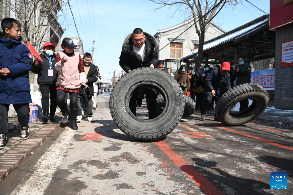 Residents take part in a tire flip game in celebration of the upcoming Lantern Festival in Hanshan District of Handan City, north China's Hebei Province, Feb. 22, 2024. The Lantern Festival falls on Feb. 24 this year. (Photo by Hu Qinghua/Xinhua)