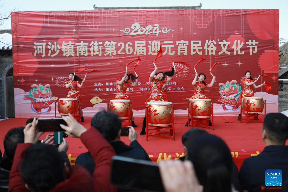 Local residents perform drums in celebration of the upcoming Lantern Festival in Hanshan District of Handan City, north China's Hebei Province, Feb. 22, 2024. The Lantern Festival falls on Feb. 24 this year. (Photo by Hu Qinghua/Xinhua)