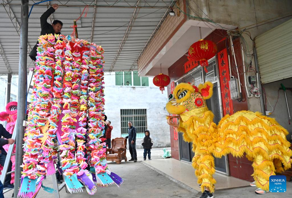 People perform lion dance in celebration of the upcoming Lantern Festival in Jinde Town of Liuzhou City, south China's Guangxi Zhuang Autonomous Region, Feb. 22, 2024. The Lantern Festival falls on Feb. 24 this year. (Photo by Li Hanchi/Xinhua)