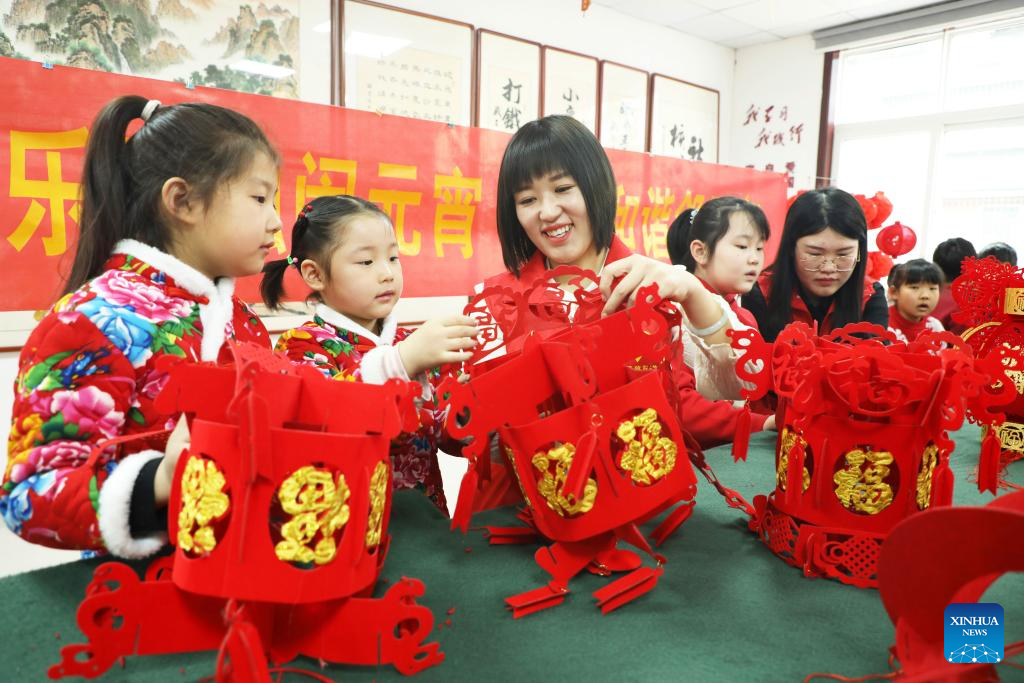 Children learn to make lanterns in celebration of the upcoming Lantern Festival in Tangshan City, north China's Hebei Province, Feb. 22, 2024. The Lantern Festival falls on Feb. 24 this year. (Photo by Zhu Dayong/Xinhua)