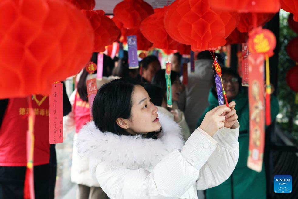 People take part in a riddle game in celebration of the upcoming Lantern Festival in Deqing County of Huzhou City, east China's Zhejiang Province, Feb. 22, 2024. The Lantern Festival falls on Feb. 24 this year. (Photo by Ni Lifang/Xinhua)