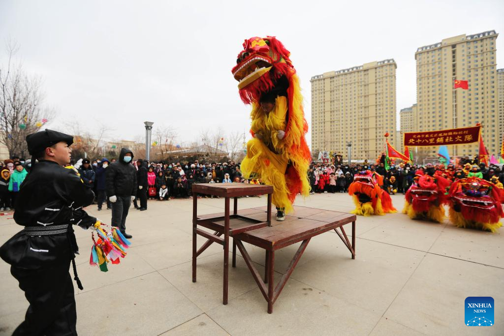 People perform lion dance in celebration of the upcoming Lantern Festival in Anding District of Dingxi City, northwest China's Gansu Province, Feb. 22, 2024. The Lantern Festival falls on Feb. 24 this year. (Photo by Wang Kexian/Xinhua)