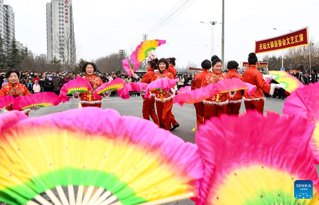 People dance in celebration of the upcoming Lantern Festival in Xiangfen County of Linfen City, north China's Shanxi Province, Feb. 22, 2024. The Lantern Festival falls on Feb. 24 this year. (Photo by Li Xianjun/Xinhua)