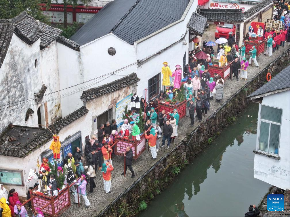 People taking part in a traditional parade in celebration of the upcoming Lantern Festival in Yuyuan Village, Wuyi County of Jinhua City, east China's Zhejiang Province, Feb. 22, 2024. The Lantern Festival falls on Feb. 24 this year. (Photo by Hu Xiaofei/Xinhua)