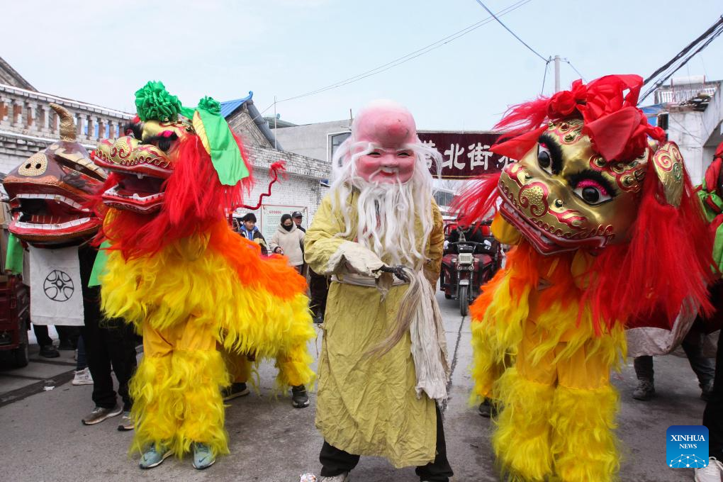 Folk artists perform lion dance in celebration of the upcoming Lantern Festival in Beizhuying Village of Boai County, central China's Henan Province, Feb. 22, 2024. The Lantern Festival falls on Feb. 24 this year. (Photo by Cheng Quan/Xinhua)