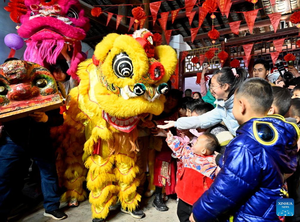 Children receive gifts from a lion dance performer in an event celebrating the upcoming Lantern Festival in Jinde Town of Liuzhou City, south China's Guangxi Zhuang Autonomous Region, Feb. 22, 2024. The Lantern Festival falls on Feb. 24 this year. (Photo by Li Hanchi/Xinhua)