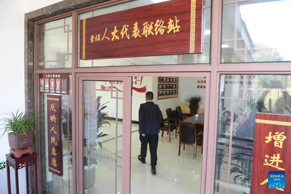 Liu Jianming works at a local legislators' liaison station in Tangdi Village of Keqiao District in Shaoxing, east China's Zhejiang Province, Feb. 19, 2024. (Xinhua/Weng Xinyang)