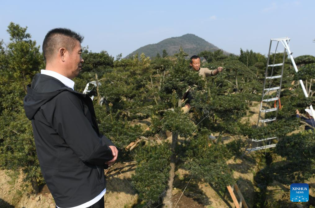 Liu Jianming (L) talks with a farmer at a sapling cultivation base in Tangdi Village of Keqiao District in Shaoxing, east China's Zhejiang Province, Feb. 19, 2024. (Xinhua/Weng Xinyang)